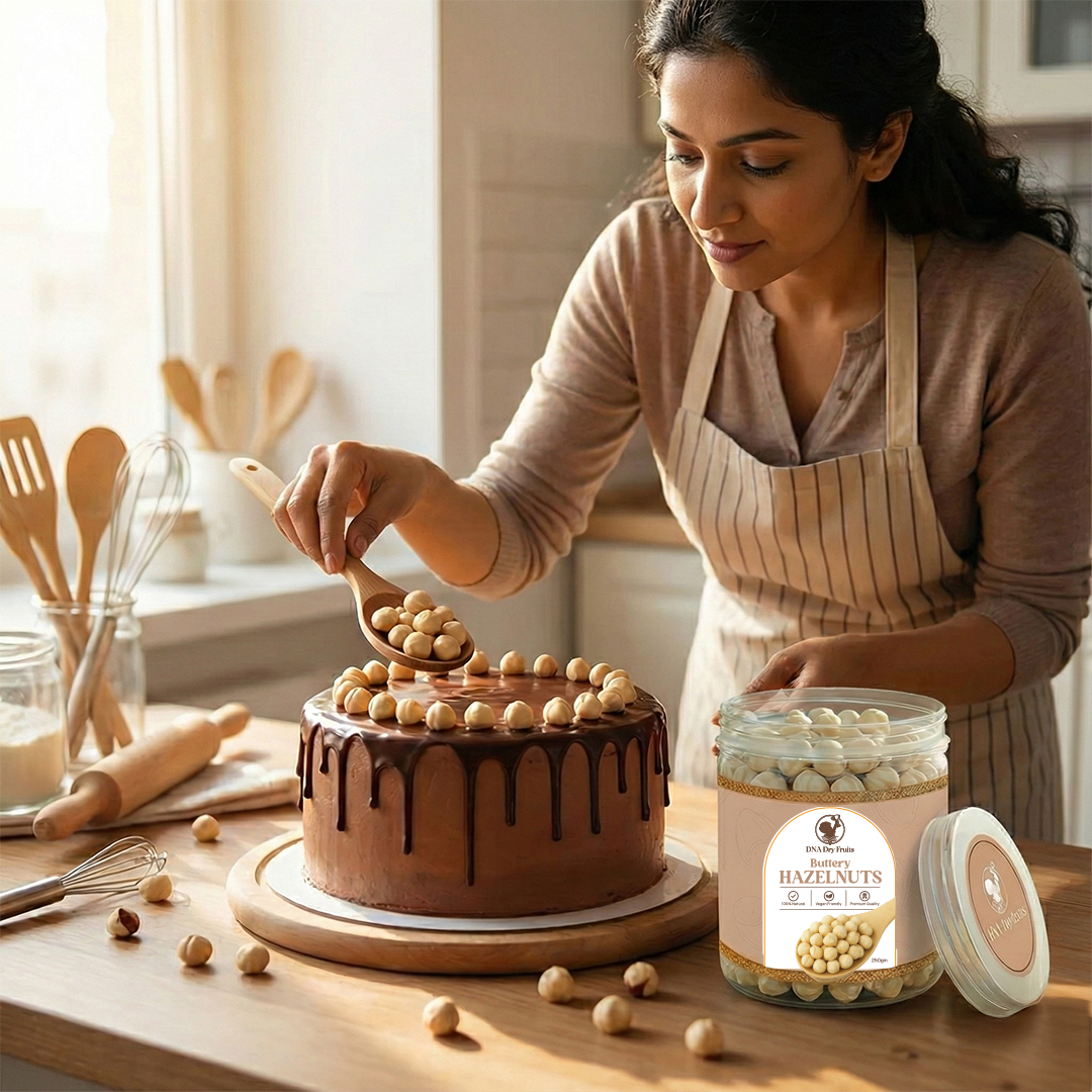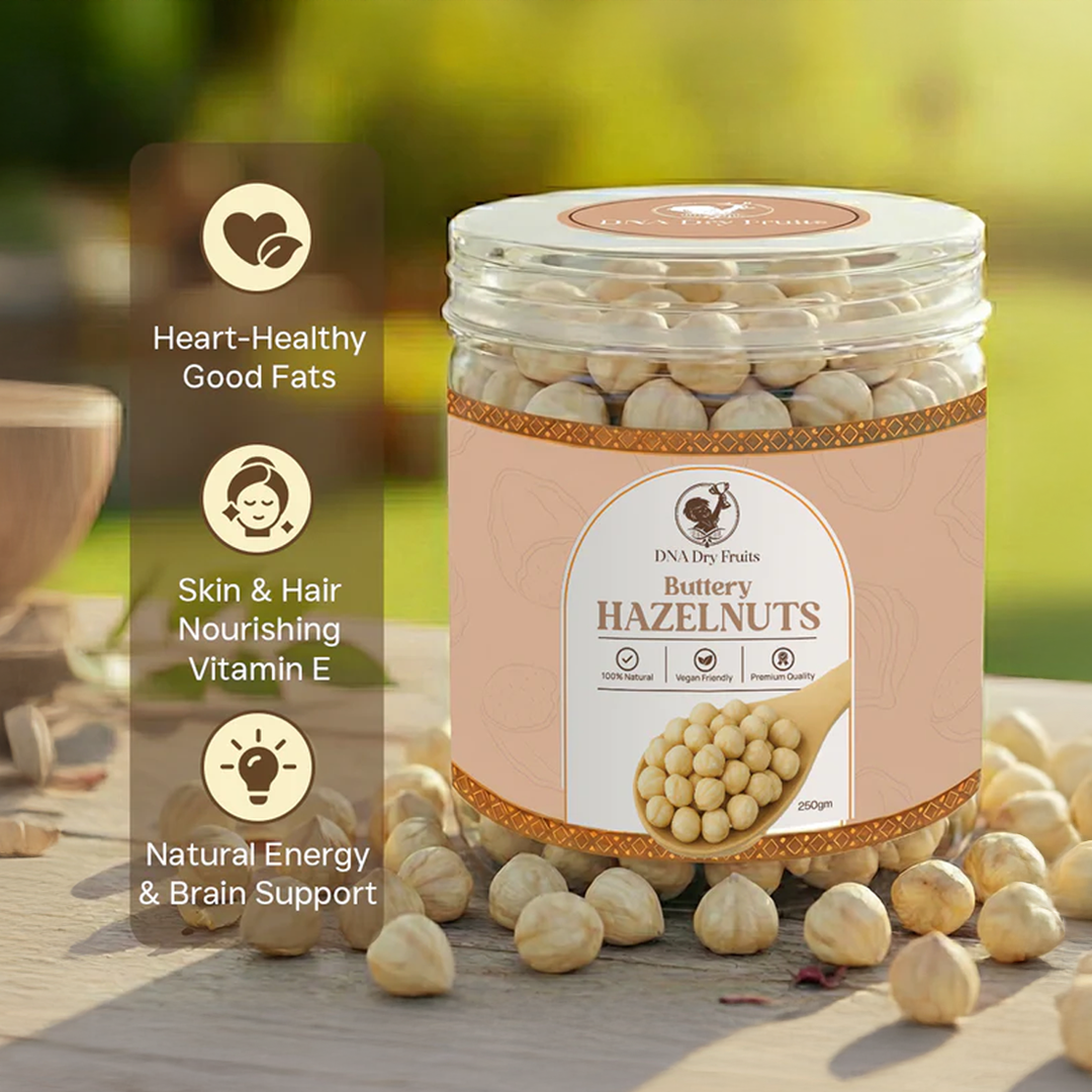 Loaded with healthy fats, plant-based protein, vitamin E, antioxidants, and essential minerals, hazelnuts are one of the best nuts for heart health, brain function, glowing skin, and daily stamina. Their naturally sweet, buttery flavour makes them a favourite for snacking, baking, desserts, smoothies, and chocolate blends.
