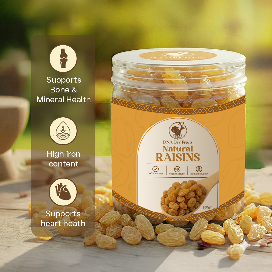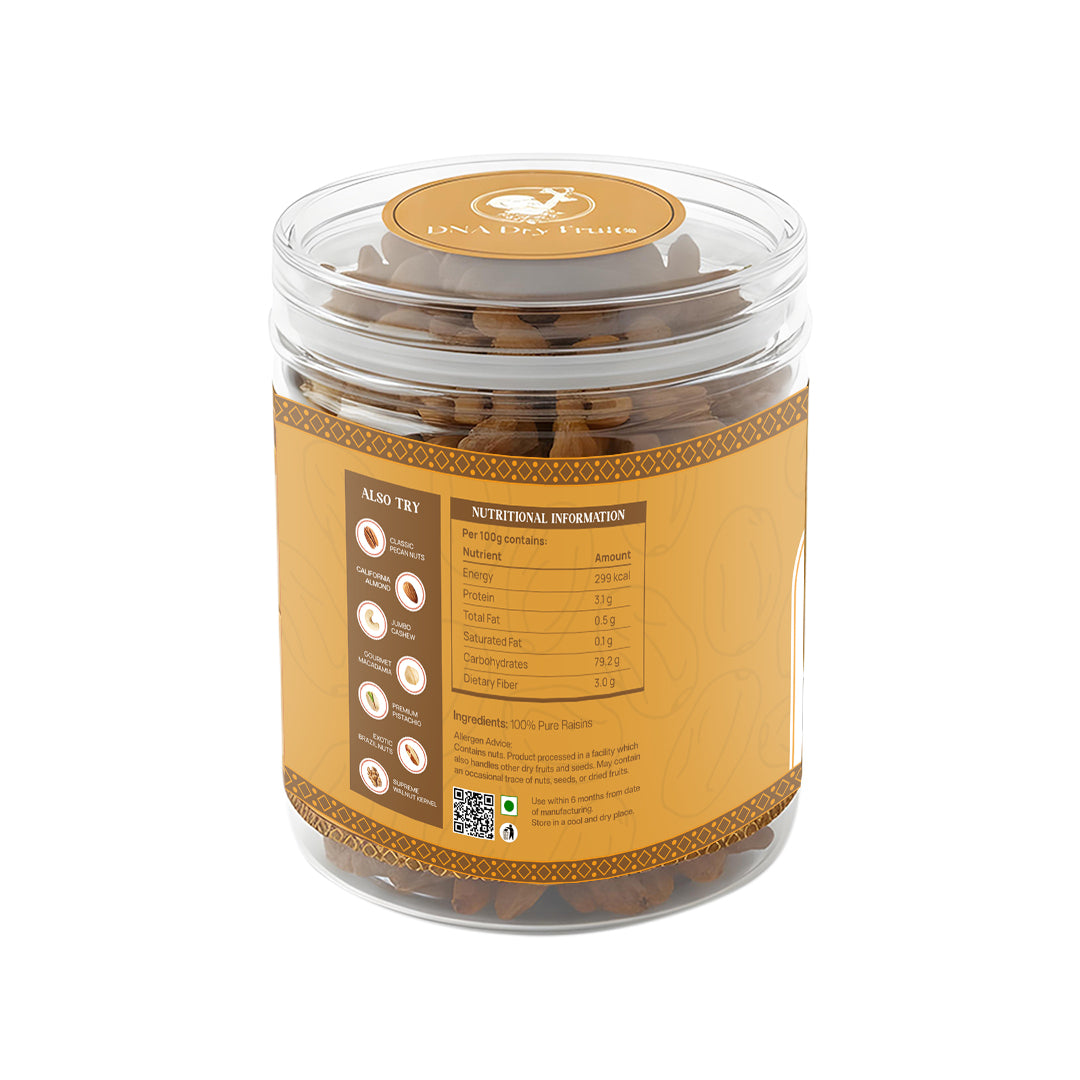 Enjoy the sweet, sun-dried flavor of DNAdryfruits Natural Raisins—nature’s classic snack, packed with wholesome energy. Rich in natural antioxidants, dietary fiber, and minerals such as iron, potassium, and calcium, these raisins support digestive health, promote heart wellness, and help maintain strong bones and healthy blood. Raisins offer a concentrated source of essential nutrients and provide a natural boost to immunity and energy, making them ideal for snacking and adding to cereals, salads, and desserts. Each pack is sealed for lasting freshness, ensuring you receive all the nourishing benefits in every bite.